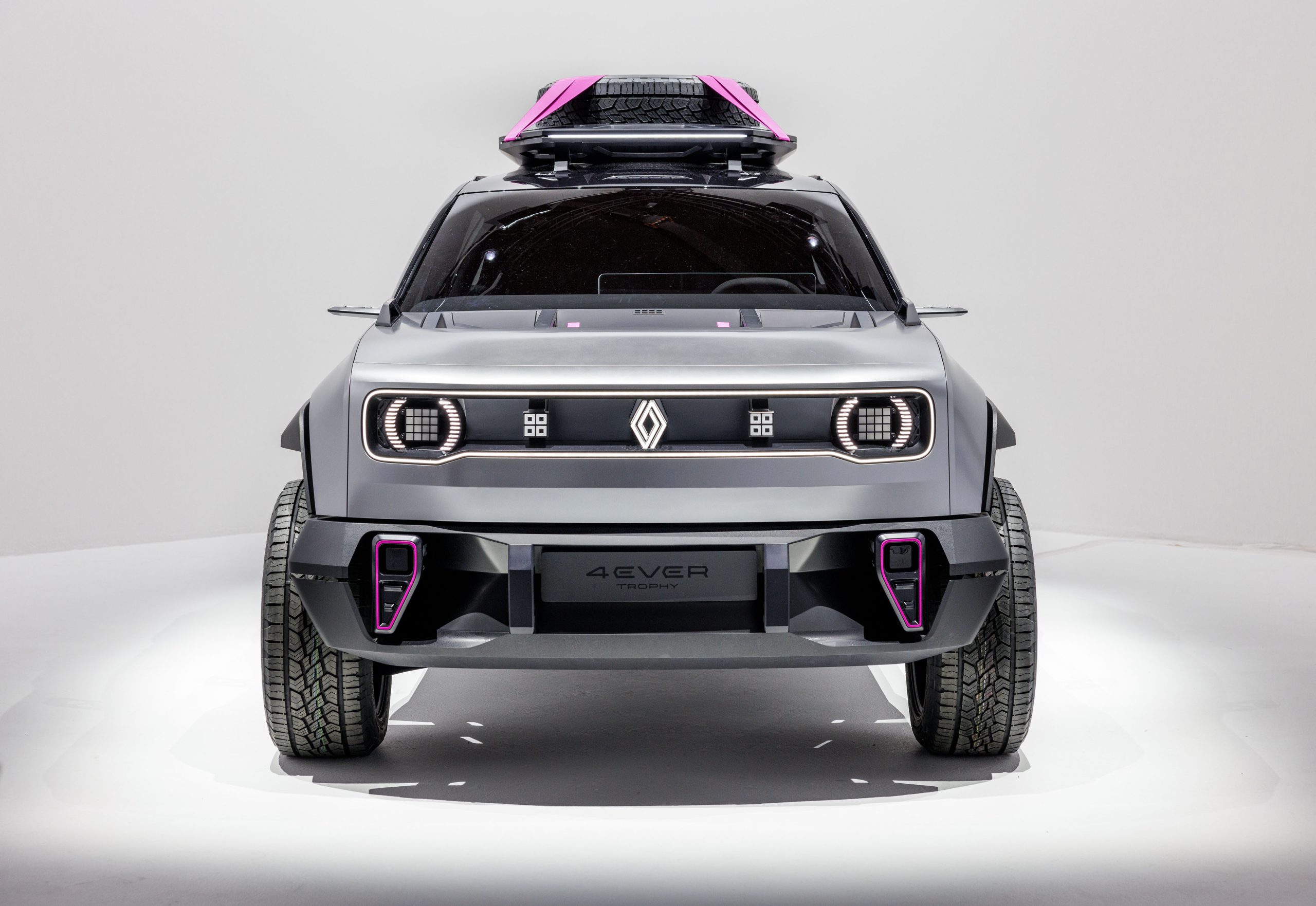 Y en Renault no solo han querido evocar su polivalencia y utilidad para el usuario corriente, sino que han buscado retomar aquel Renault 4 que nos maravilló conquistando los terrenos más inaccesibles. Por ello, su nombre 4EVER TROPHY se convierte en su primer homenaje. Pero hay más. La ranura de aire del capó para que entre aire al radiador, la baca de fibra de carbono con la rueda de repuesto sobre el techo, los pases de rueda con un voladizo de más de 20cm, llantas de 19 pulgadas…